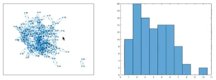 • Erdos-Renyi graph with 100 nodes and degree 4, with histogram represengin the degree distribution: