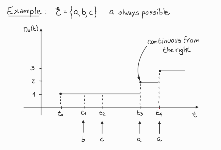 The score of event at time , denoted , is the number of total lifetimes of event used up to time .