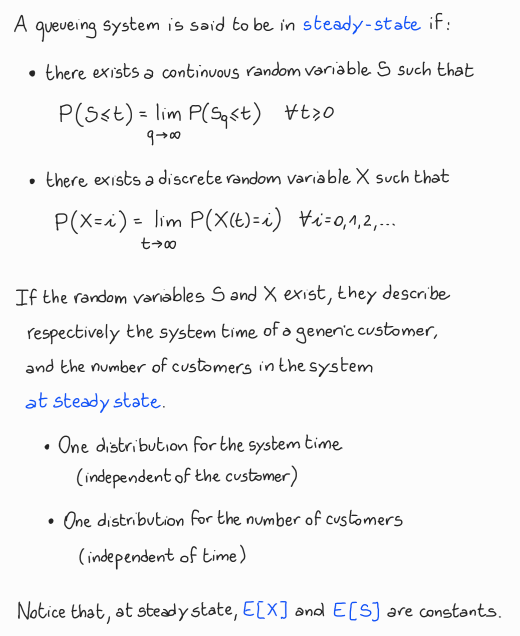 We can use this limits to forget about the dependency of the system with time, saying: “At steady state the average number of customer in the system will be E and each customer will stay in the system E seconds/minutes/hours/… (it depends on how you declare )”