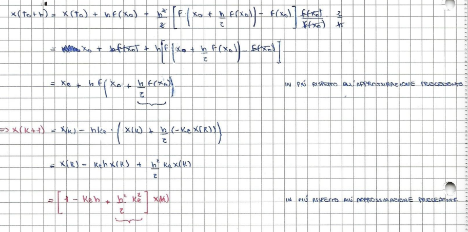 Vediamo invece lo stesso esempio, ma stavolta si utilizza il metodo del mid-point, il quale considera il anche secondo termine derivato dell’espansione. Si supponga di avere un sistema ad evoluzione libera:La derivata seconda è stabilita sempre tramite l’espansione di Taylor svolta su :Dove:Ma non si conosce , secondo il metodo del mid-point:In modo da semplificare questa espressione. Dunque sostituendo tutto nell’equazione iniziale:Che possiamo scrivere propiamente in tempo discreto, utilizzando i dati del problema come:Il termine aggiuntivo permette maggiori.