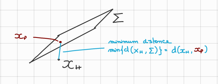 xh​= <xhx​, xhy​, xhz​>the minimum distance from the place Σ (ax+by+cz+d=0) can be computed as the distance of xh​ from xp​ (p: proxy) where xp​ is defined as the projection of xh​ onto Σ.