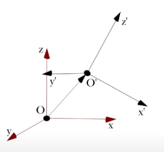 \end{array} & \kern5px 1 \end{array} \right]_{4\times4} $$ Where: - $R^O_{O \kern 1px '}$ : [[HCR - Rotation Matrix|rotation matrix]]. - $O \kern 1px '$ : distance $\overline{O \kern 2px O \kern 1px '}$ Then we can write the following transformation given a point $p^{O}$ in the reference frame $O$ we can find the point $p^{O \kern 1px '}$ in the reference frame $O \kern 1px '$:$$p^{O \kern 1px '} = T_{O \kern 1px '}^O \cdot p^{O}$$ > **NOTE**: > The 3 zeros elements in the last row are usually unchanged but sometimes they do change, when they do it's because we want to impose the **concept of prospective**, for example when using a camera some dimensions are forcefully distorted (closer objects appear bigger). > **NOTE**: > The last element $(4,4)$ is often $1$, but it can be changed to reference the **scale of my robot or environment** ($0.1$, $0.01$, $0.001$, ... when working with small robots, while we'll change it to $10$, $100$, $1000$, $10000$ for big robots) ---- The **inverse** of a **tranformation matrix** $T$ is also a transformation matrix, and can be computed as:$$\begin{array}{l} T^{-1} &=& \left[\begin{array}{c} R^O_{O \kern1px '} & O' \kern2px \\[5px] \begin{array}{c} 0 & 0 & 0 \end{array} & 1 \end{array}\right]^{-1} \\[-5px]&\kern3px\downarrow&\\[-5px] &=& \left[\begin{array}{c} \left(R^O_{O \kern1px '}\right)^{\tiny T} & -\left(R^O_{O \kern1px '}\right)^{\tiny T} \cdot O' \kern2px \\[5px] \begin{array}{c} 0 & 0 & 0 \end{array} & 1 \end{array}\right] \end{array}$$***Source***: [Mecharithm (reading)](https://mecharithm.com/learning/lesson/homogenous-transformation-matrices-configurations-in-robotics-12#:~:text=The%20inverse%20of%20a%20transformation%20matrix%20T%20%E2%88%88%20SE(3)%20is%20also%20a%20transformation%20matrix%20and%20can%20be%20computed%20as) ^inverse-of-a-transformation-matrix