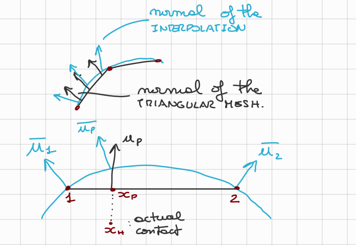 NOT_SURE_ABOUT_THIS We consider to have the normal to each point/vertex of the triangular mesh, actually we should have the normal of each TRIANGLE of the mesh, so we would need to interpolate especially when we are near a vertex