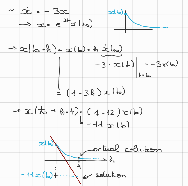 - Dato un valore iniziale in , il metodo di Eulero calcola il valore della funzione nel passo successivo come:==Questo processo può essere ripetuto iterativamente per trovare la soluzione approssimata a , , e così via==.
