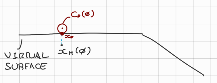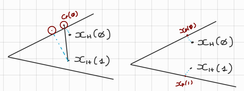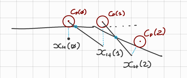 - In case of collision, for the first time @ tk=0 (→ xh(0)) we compute the normal proxy and we take the tangent circle for the proxy xp given a small radius ϵ (in the figure below Cp(0)):