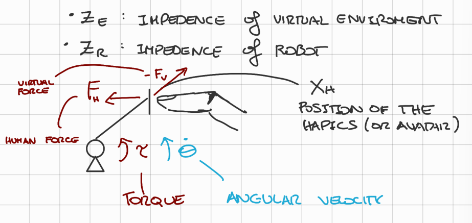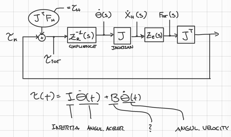 Then the total torque will be:Also remember that:Then:What is really felt by the human is the Force of the human itself and the velocity which is controlled by both and , then:$$ F = Z_p(s) \cdot \Large \dot{\normalsize X}\normalsize _h \cdot \frac{1}{s}