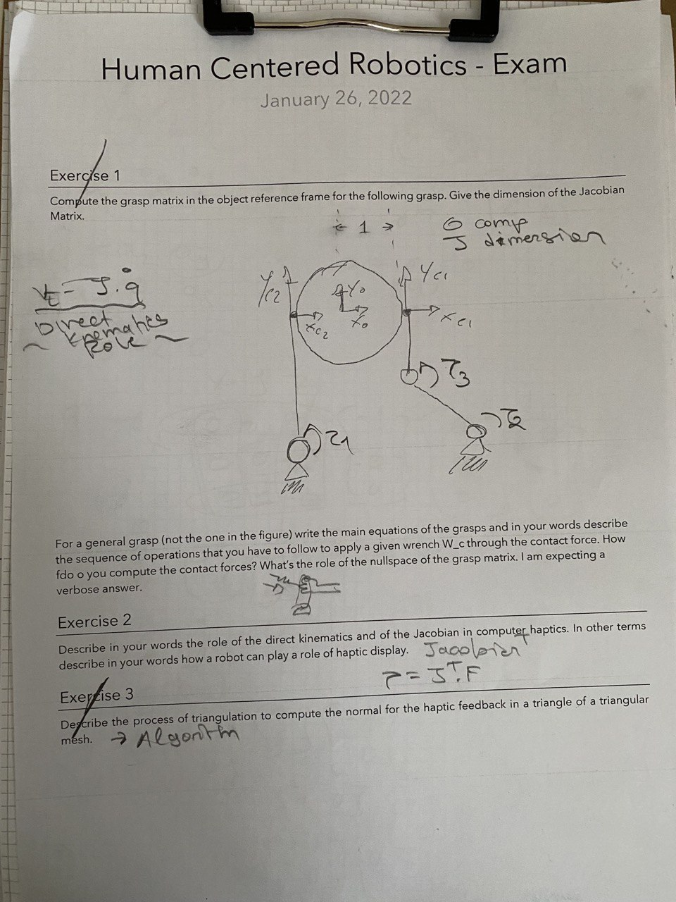 (Exercise 1) First we define the contact pointsd1 and d2 with respect to the center of the object/the reference system of the object, so:d1=[1,0,0],d2=[−1,0,0]Then from these we define their respective screw matricies, so:S(d1)=0000010−10S(d2)=00000−1010Then we define the grasp matrix:G=1000000100010010−1010000001000−1001010Then we define the hand Jacobian, since we don’t have the dimensions of the arms, I’ll define them like so:b1=0b1y0,b2=b2xb2y0,b3=0b3y0As we can see the z axis is 0 for all of them, then like for the grasp matric we define the screw matrices for all of them:S(b1)=00−b1y000b1y00S(b2)=00−b2y00b2xb2y−b2x0S(b1)=00−b3y000b3y00Then we’ll constract the complete hand Jacobian:JT=00−b1y000000000000000b1y0000000000000−b2y00−b3y00000b2x000000b2y−b2x0b3y00The complete hand jacobian, will have dimensions: [9×6], if we were to reduce it, so by not considering the z component for the torques, since we can say that for construction of the manipulator τx and τy will be always 0, so if we write the complete formula:τ1xτ1yτ1zτ2xτ2yτ2zτ3xτ3yτ3z=00−b1y000000000000000b1y0000000000000−b2y00−b3y00000b2x000000b2y−b2x0b3y00F1xF1yF1zF2xF2yF2zWe can reduce this formula, by considering τ1x=τ1y=τ2x=τ2y=τ3x=τ3y=0, so:τ1zτ2zτ3z=−b1y000000000−b2y−b3y0b2x0000F1xF1yF1zF2xF2yF2zNow the reducedhand Jacobian has dimensions [3×6]. More generarly, given a general grasp, so we are talking about nc contact points (so d1,…,dnc). We want to apply a wrench WC through the contact force FC: 1. We define the screw matrices for all of them, so: S(d1),…,S(dnc) and S(b1),…,S(bnj) 2. We calculate the grasp matrixG:G=[IS(d1)……IS(dnc)] 3. We resolve the following formula to obtain the contact force to apply:FC=G#⋅WC+N(G)⋅ξDove: •G# indica la pseudoinversa di G. •N(G) è il nullspace di G. We need to say however that for these forces to apply, they need to be inside the friction cone, unless we are talking about an enveloping grasp, so that for N(G)=0 then the system has only has only one solution menaning that the forces need to be inside the friction cone, otherwise we would not have a grasp, and the object would slip, and with N(G)=0 we cannot change the friction cone, in any way. While for N(G)=0 we can change the ξ vector such that the normal forces with respect to the surface/plane where the contat points are, increase and so does the friction cone, so for N(G)=0 we can ensure the grasp. Also we have said that if G has max rank (more specifically rank=6) then we have a grasp that can move and rotate the object in every direction, since we can always find an FC such that:WC=G⋅FCNOT_SURE_ABOUT_THISIf the matrix was a square one the proof could be simple, since a square matrix with max rank is always invertible, but in this case we are talking about a rectangular matrix