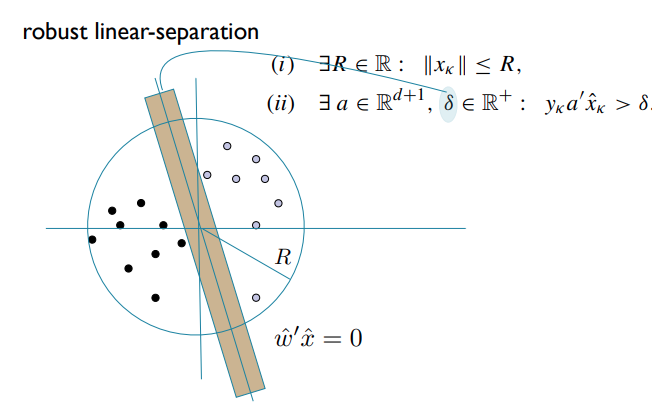 Robust because all the points are divided from the linear separation by a factor of (distance), this value is not known at prior, it can be found as the of the distances from the line of linear-separation and all the points.