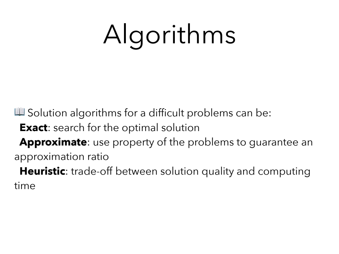 NO - Exact Algorithms NO - Approximate Algorithms NO - Heuristic Algorithms → NO - Greedy (Heuristic) Algorithms → NO - Metaheuristic (Heuristic) Algorithms