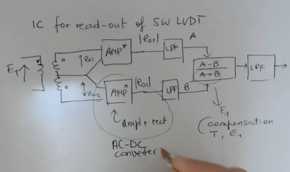 With respect to the previous LVDT sensor, this time we have a differential amplifiers, instead of a carrier amplifier, but I need an additional LPF, and an additional wire, and this could be more complex in terms of connection and cabling.