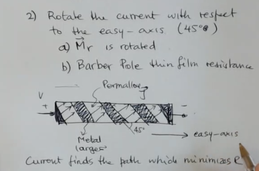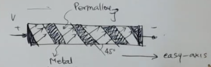 Let’s see how we can rotate the current: We can create a “barber pole” using two different conductors (for example a “Permalloy” and Metal) and we bond them with this structure: