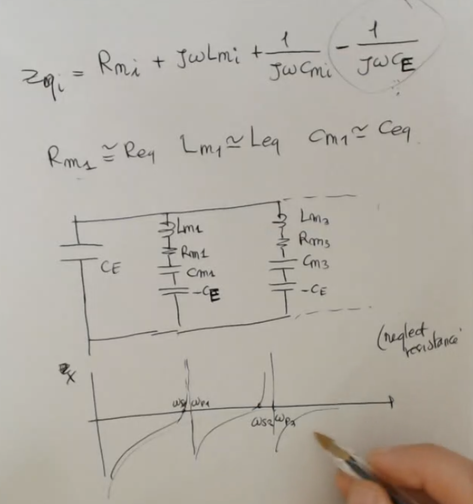 Actally this is an approximation, if we were to plot and model the real behaviour of the quartz we wold need an infinite numeber of impedances in parallel to :