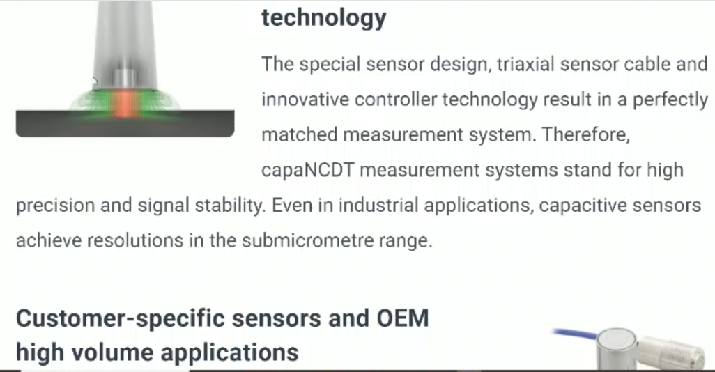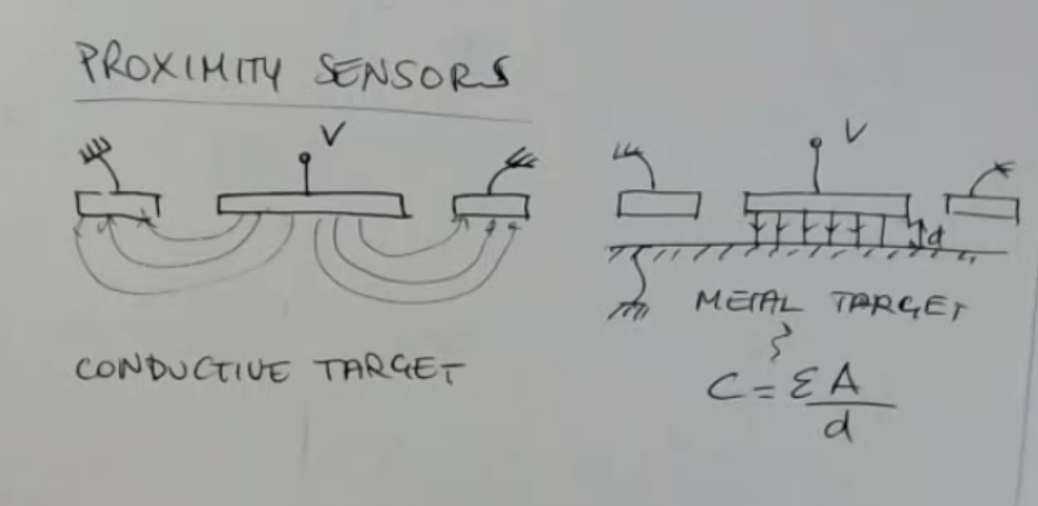 We have seen an example of a capacitance sensor, with real world values, remember this: ==A circular capacitive proximity sensor with radius , measuring an object away will assume a capacitance of about ==.