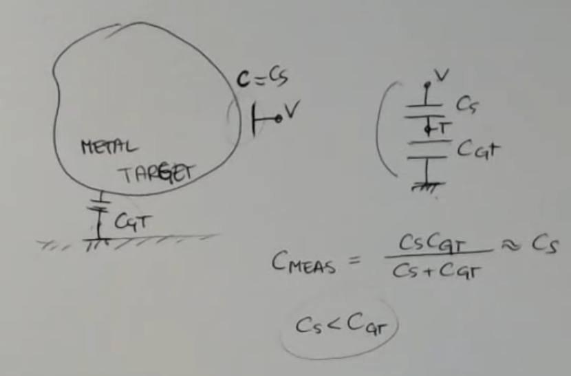 What happens, instead, if I have a large, conductive target, which is also not grounded? ⇒ The parasitic capacitance formed between the ground and target can be ignored. More specifically if: (And this is true if the area of the sensor is much smaller that that of the target) Then the parasitic capacitance can be ignored: