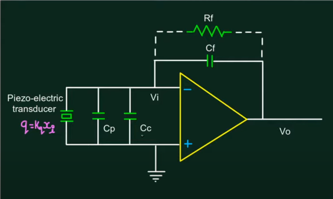 - The output voltage is proportional to the charge produced by the piezoelectric transducer.