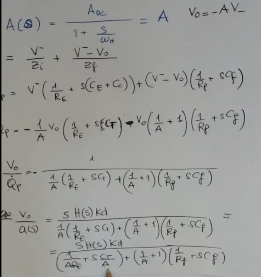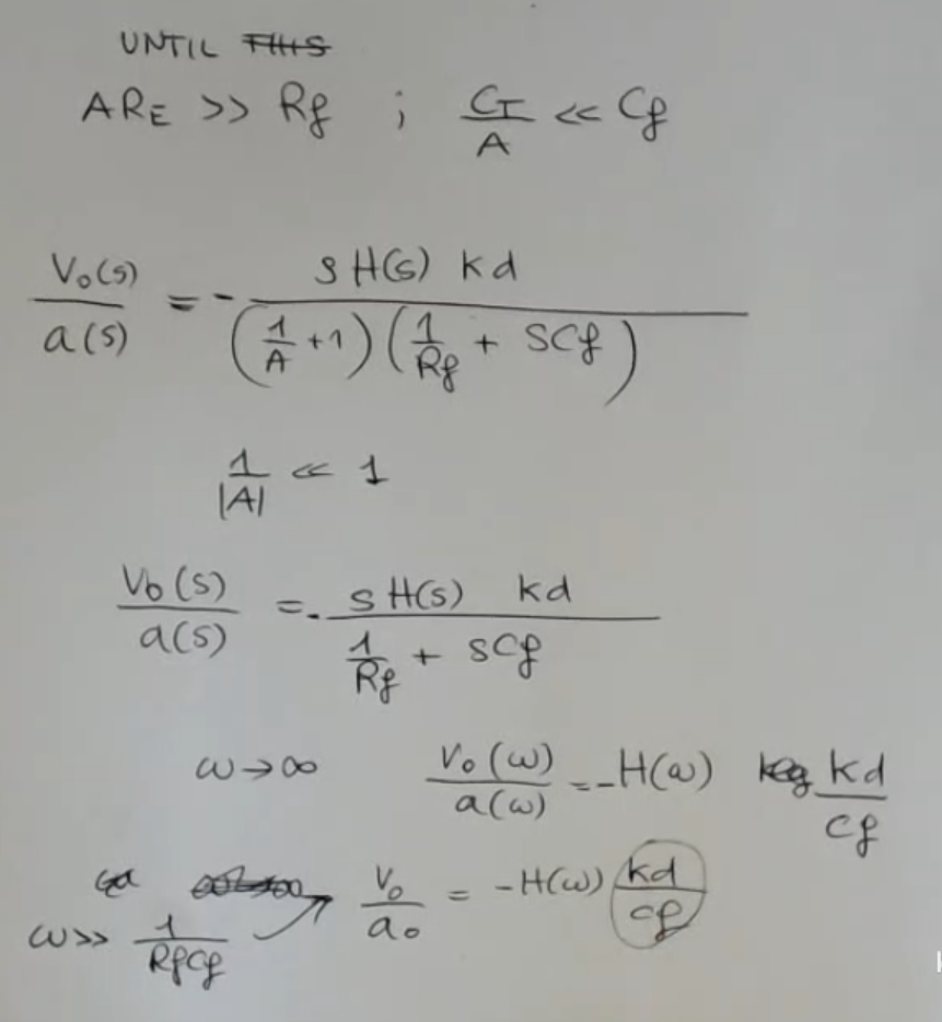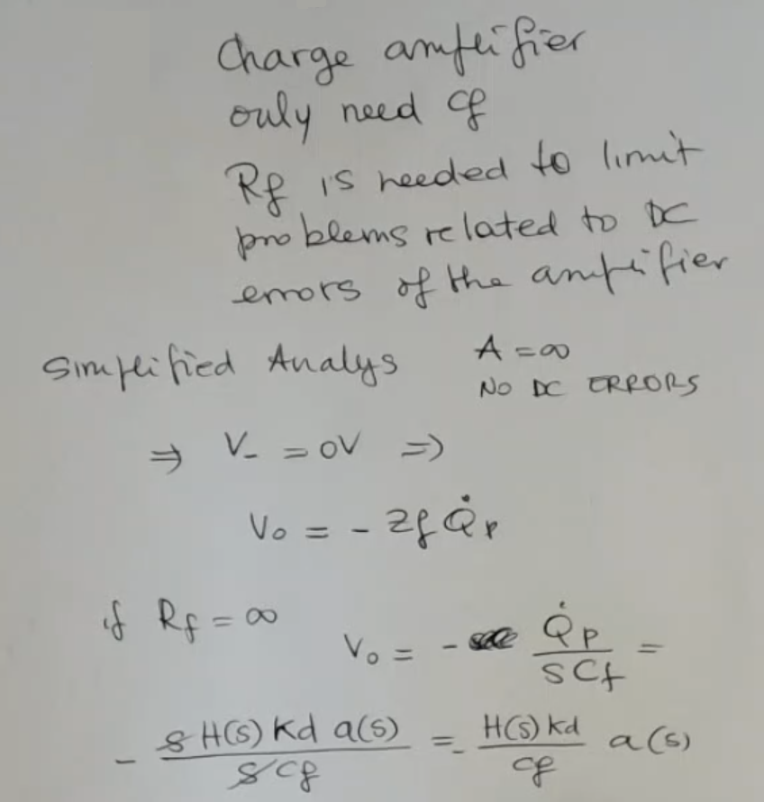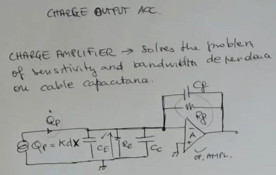β So the charge amplifier solves the problem of sensitivity and bandwidth dependence on cable capacitance. - With the addition of this amplifier, we impose that the voltage drop across all resistances and capacitance , , and is , doing this all the current (created by the piezoelectric effect) can flow into .