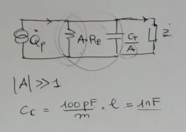 But if you divide this value here for the gain of the amplifier which if the amplifier is selected correctly is very high then you reduce this capacitance, and you are able to neglect the presence of the cables. - I have incapsulated the amplifier in the values of the parasitic components.