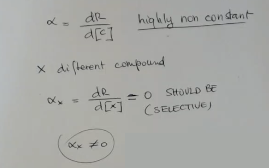 The sensitivity:is higly non-constant, so this is a non-linear sensor. Also as we have said these are non-selective devices, in fact for a different compound than the one we want to measure, we have:A selective device would have .