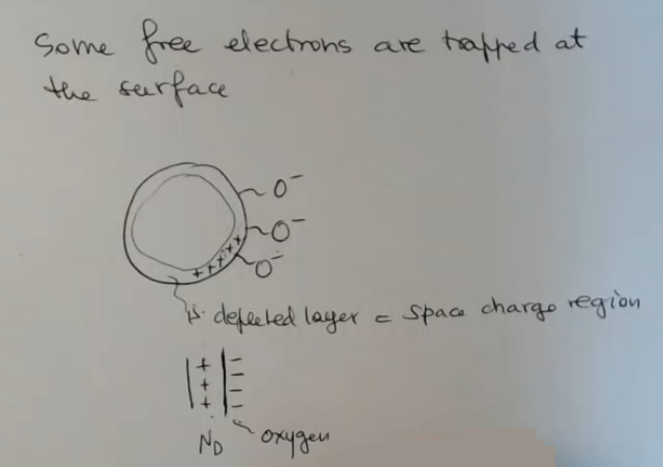 ⇒ ==So at these temperature these intrinsic semiconductors behave as extrinsic==:Now that I have depleted the layer under the surface, meaning the layer has no electrons, since they have been taken by the absortment compound, which is oxygen in this case.