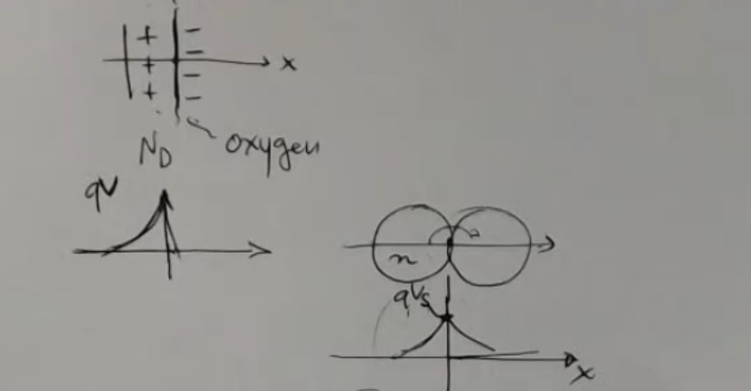 So obviously you have a minus charged layer, a positive charged layer, so you have an electrical field, and associated with this electrical field, you have a voltage barrier, which is like this: