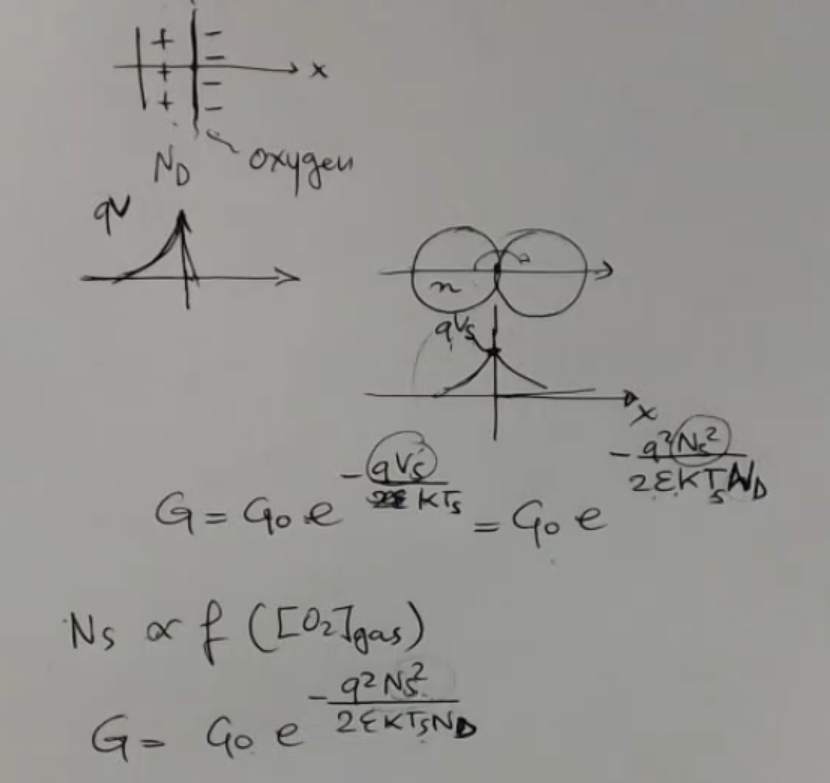 On the surface of these grains here, the gas, which I want to sense, (let’s consider oxygen for instance) is absorbed. After being absorbed on the surface, there is a transfer of charge from the sensor (from the metal oxide) to the gas, and vice versa. So for instance, oxygen tends to take an electron from the metal oxide, and it traps this electron, this negative charge, on the surface. Now I have a charged species on the surface, with a certain density, which I call :