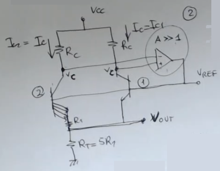 - The bases of the BJT (1) and (2) are at the same voltage, and the circuit here is concluded with a feedback loop.