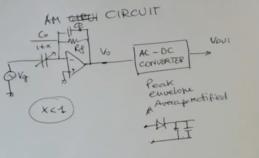 - At the end we can see a simple AC-DC Converter (Alternating Current to Direct Current Converter) (a “peak” or “envelope”, or “average rectified”) circuit.