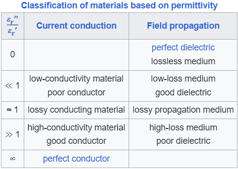 - We have seen a table that describes a material based on the ratio of its real permittivity and imaginary permittivity (Source: Wikipedia):IMPORTANTE