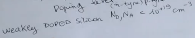 We find that for weekly doped silicon, meaning that the density of dopants is:The piezoresisitvity of the silicon starts to depend also on its doping concentration. Meaning that the piezoresisitivity of weakly doped silicon has a weak dependance on the doping concentration. While heavely doped silicon will have a strong dependance on the doping concentration.