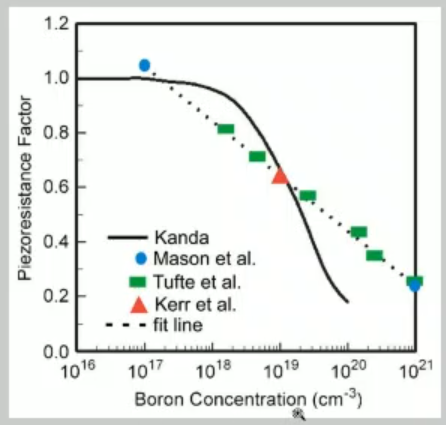 - ==As the concentration of Boron increases (an acceptor, p-type doped silicon, more holes) the piezoresistance factor decreases==
