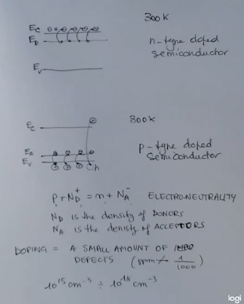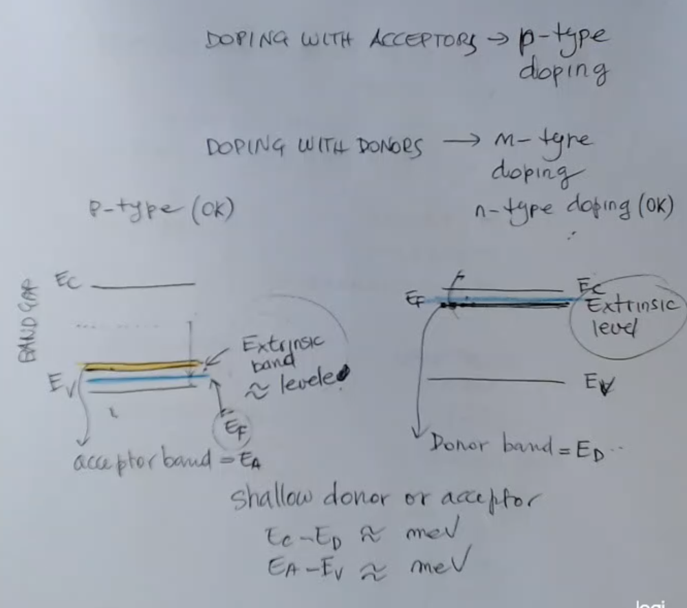 - We can model the doping (donor or accepetor) with an added energy level, or extrinsinc band, near the valence (for p-type) or conductance band (for n-type).