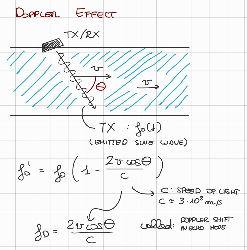 The recived frequency of the transmitted signal is changed by a factor off0′=f0(1−fD)Where fD (called the “doppler shift”) depends on the angle and speed of the flowing liquid, like so:fD=c2vcosθAnd: