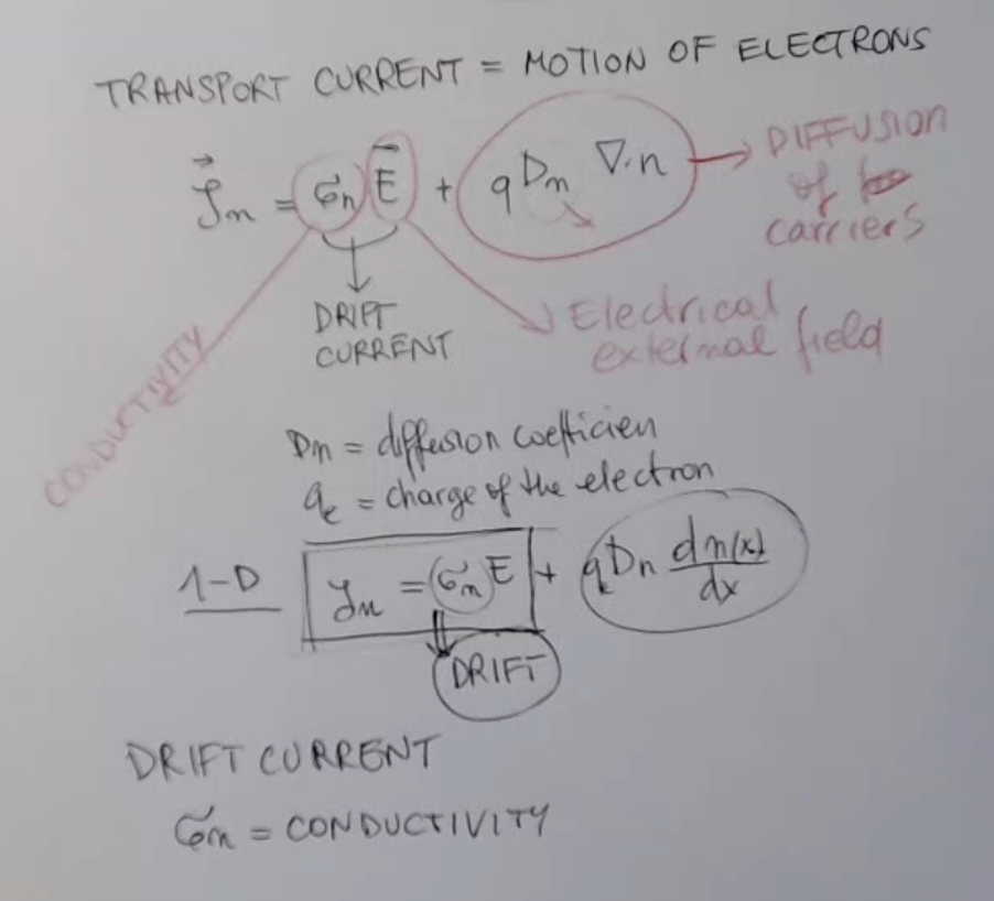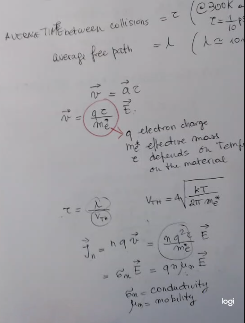 Relation between the avereage time between collisions (τ) and the average free path (λ):τ=VTHλWhere vTH is called the “mean thermal velocity”, and it is defined as:VTH=42πme∗kTThe transport current, supposing an symmetrical distribution of carriers (so: ∇⋅n=0), will be equal to:\begin{align}