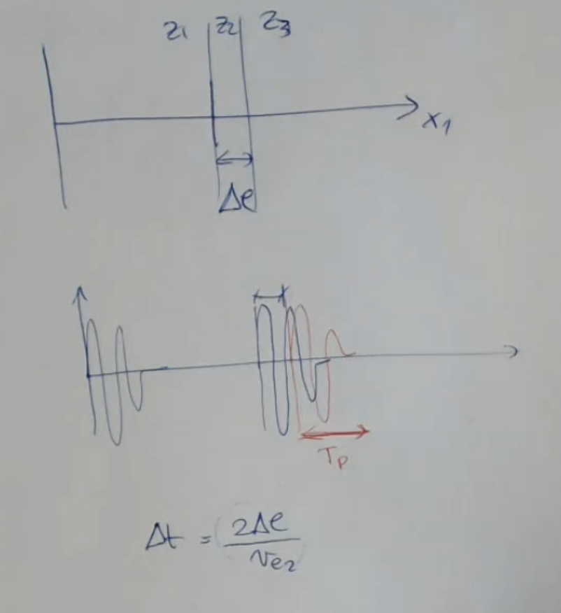 You can also see it as: how far away the two echos are from each other.- So we have to assure that the pulse duration much smaller than the time-of-flight-difference between the second and third material ():So, if we perform some calculations we ombtain that the must be:Where: