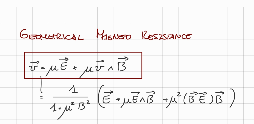 Starting from the current density equation:We can rewrite it as:And if subject the carriers also to a magnetic field, the formula changes into:IMPORTANTE This is the “geometrical magneto resistance formula”. Where: