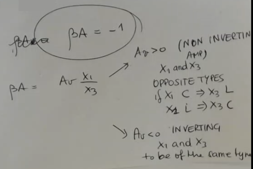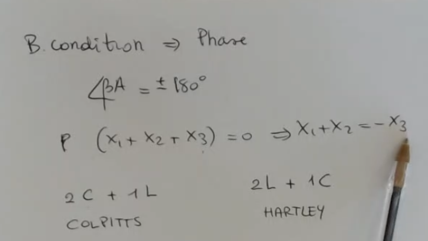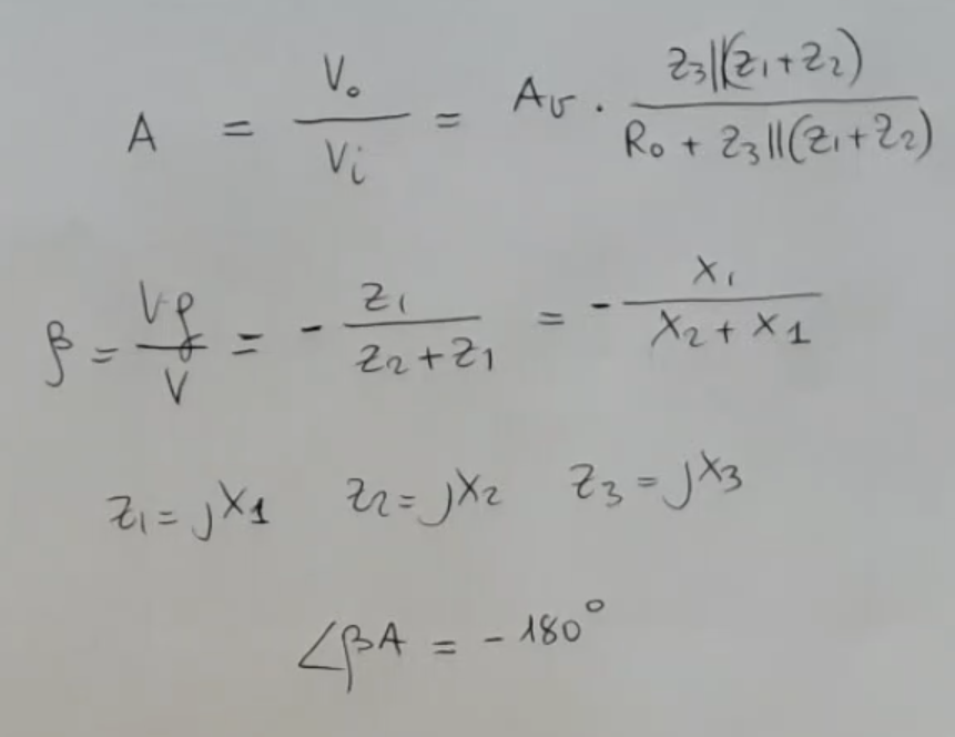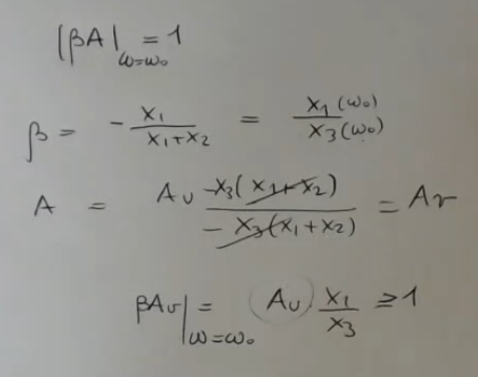 Then we apply the Barkhausen conditions, so:But if , , , are imaginary (so if we use only capacitances and inductances, as we have supposed in the construction of the oscillator) then is a real negative number.