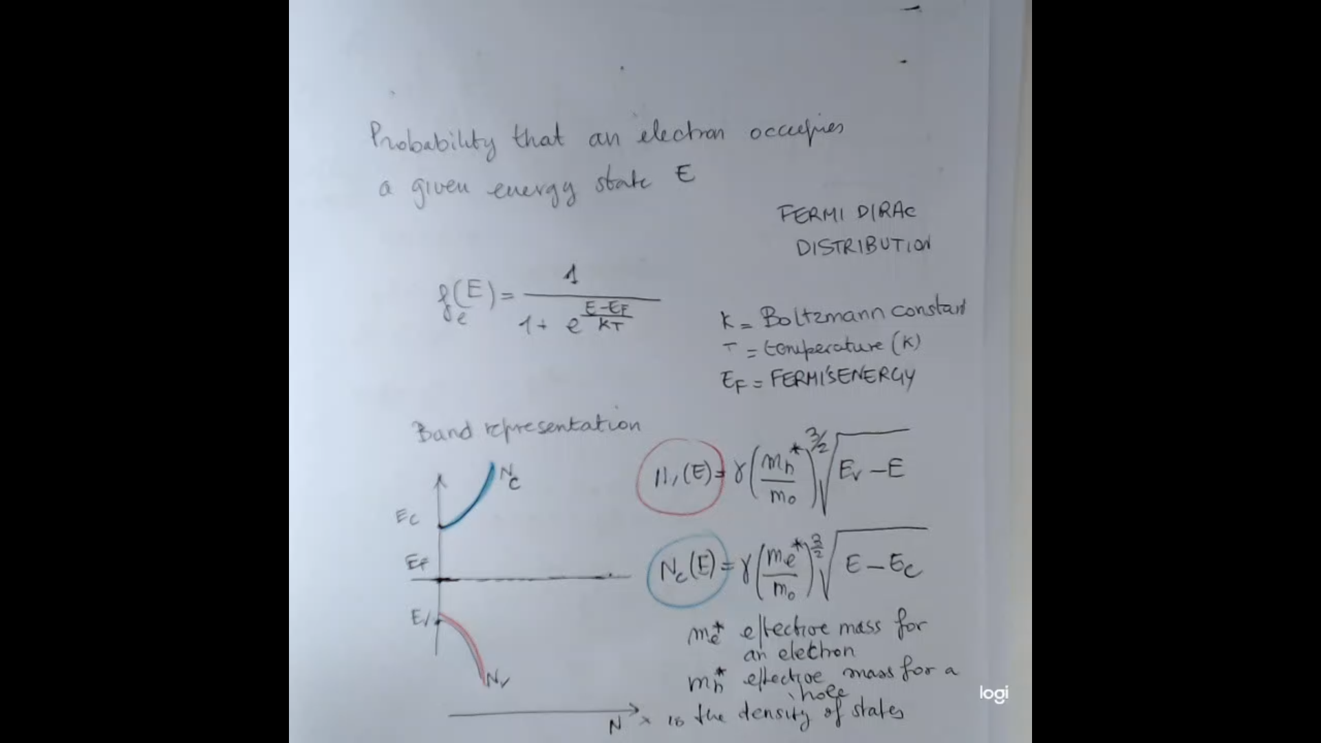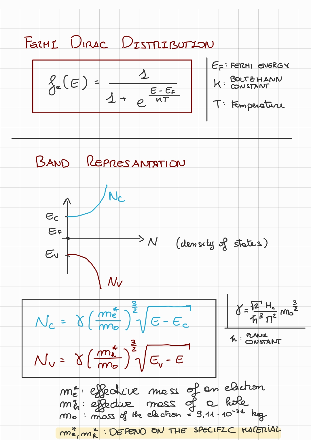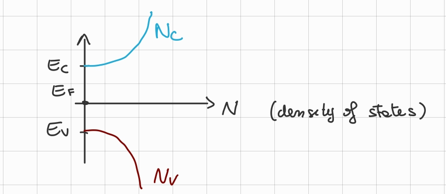 Then we have to remeber the density of states functions, these represent the density of states in the conduction band (at a certain energy level ): $$N_C(E) = \gamma\left(\frac{m_e^{*}}{m_0}\right)^{\frac{3}{2}}\sqrt{E-E_C}$$$N_C(E)E$. It tells you how many electrons can potentially occupy a specific energy level in a material.