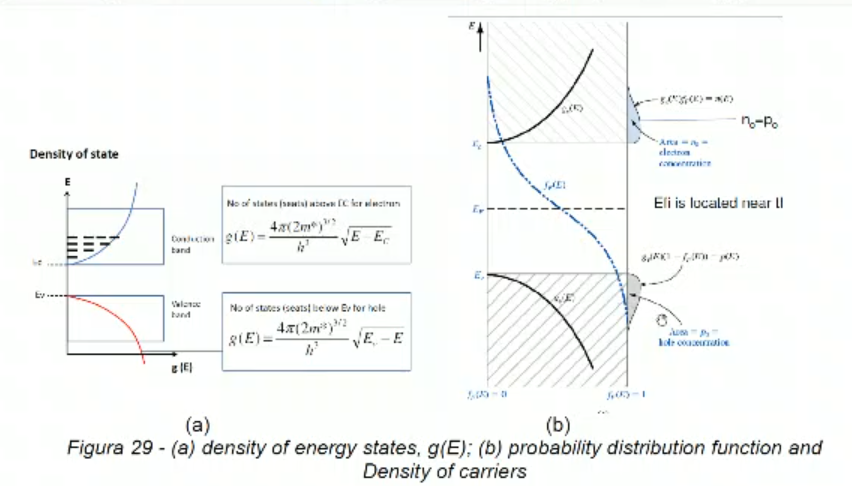 Now if we wish to know the exact density of free electrons and free holes, so of carriers (free electrons and free holes will aid to conduction), we can integrate the density of states of the Conduction Band with the fermi energy like so, the density of electrons in the Conduction Band is:And, the density of holes in the Valence Band is:Where: