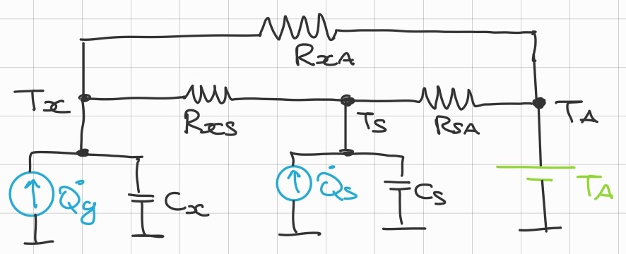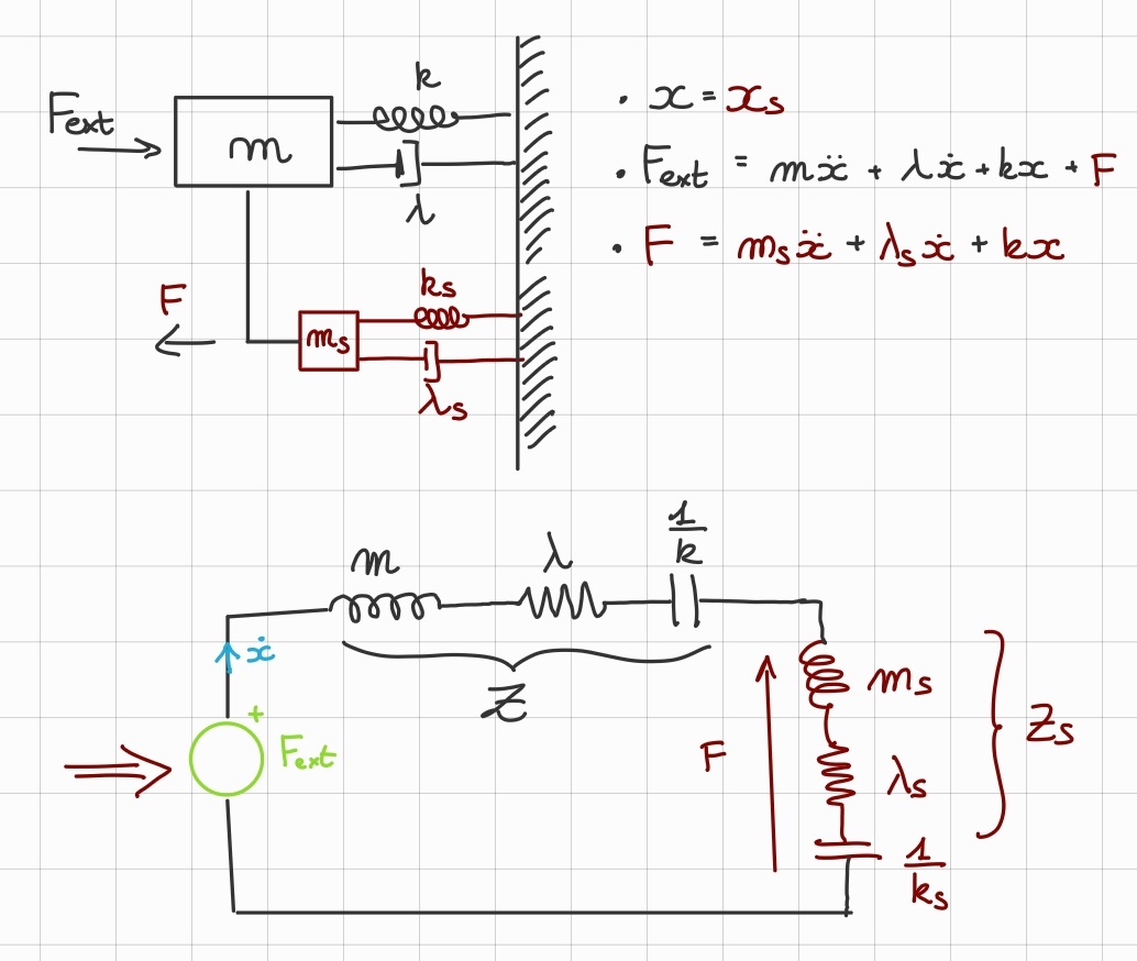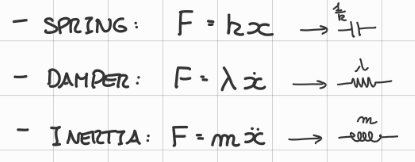 System Effort Quantity Flow Quantity Impedances Thermal Domain Temperature Difference :Δ T ( s ) Heat Flux :Q ˙ ( s ) Thermal Resisitance due to Convection :R TH = h A 1 Thermal Resisitance due to Condution :R TH = k A t Thermal Capacitance :C TH = c ⋅ V Mechanical Domain Force :F = ma Speed :x ˙ A Spring is modelled as a Capacitance :C = k 1 A Damper is modelled as a Resistance :R = λ A mass is modelled as an Inductance :L = m Magnetic Domain Magneto Motive Force :MMF = N ⋅ I Flux of the Magnetic Field :ϕ ( B ) = μ H S Reluctances are modelled as a resistance :R = μ S l Permanent Magnets are modelled as a Voltage genrator and a relactance, so :R M = μ M S M l M MMF = R M ⋅ ϕ ( B r ) ϕ ( B r ) = S M ⋅ B r = μ 0 ⋅ S M ⋅ M r Acustic Domain How fast the wave changes form :u ˙ Stress (for Solids) :T Preassure (for Liquids) :p Acustic Impedance :fluids: solids: Z = u ˙ 1 p Z = u ˙ 1 T 11 Or :Z = ρ ⋅ v l