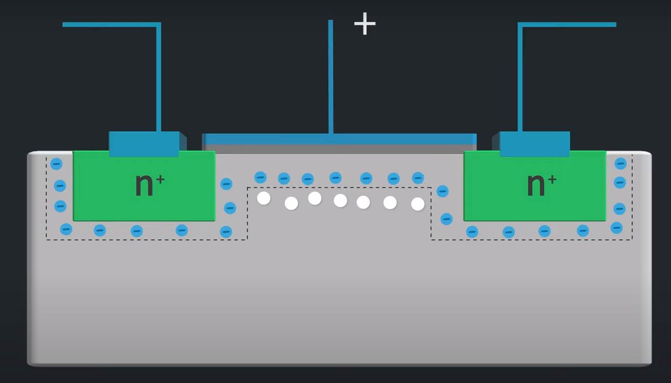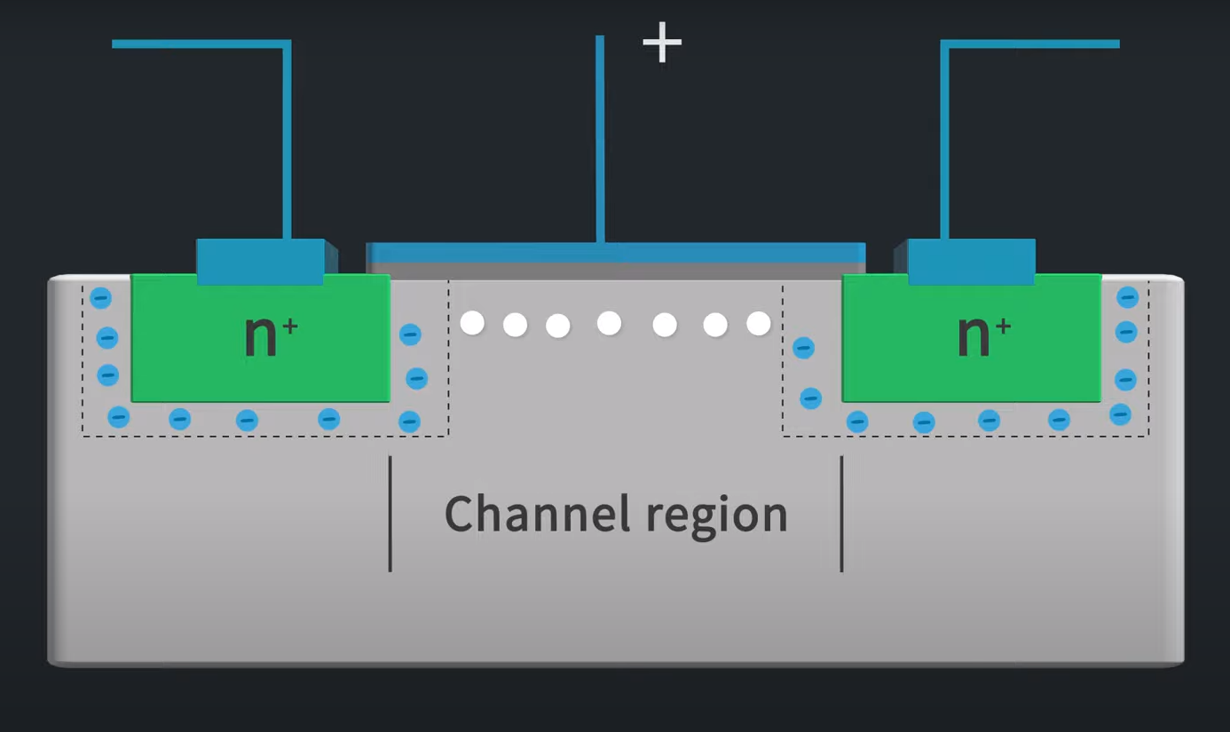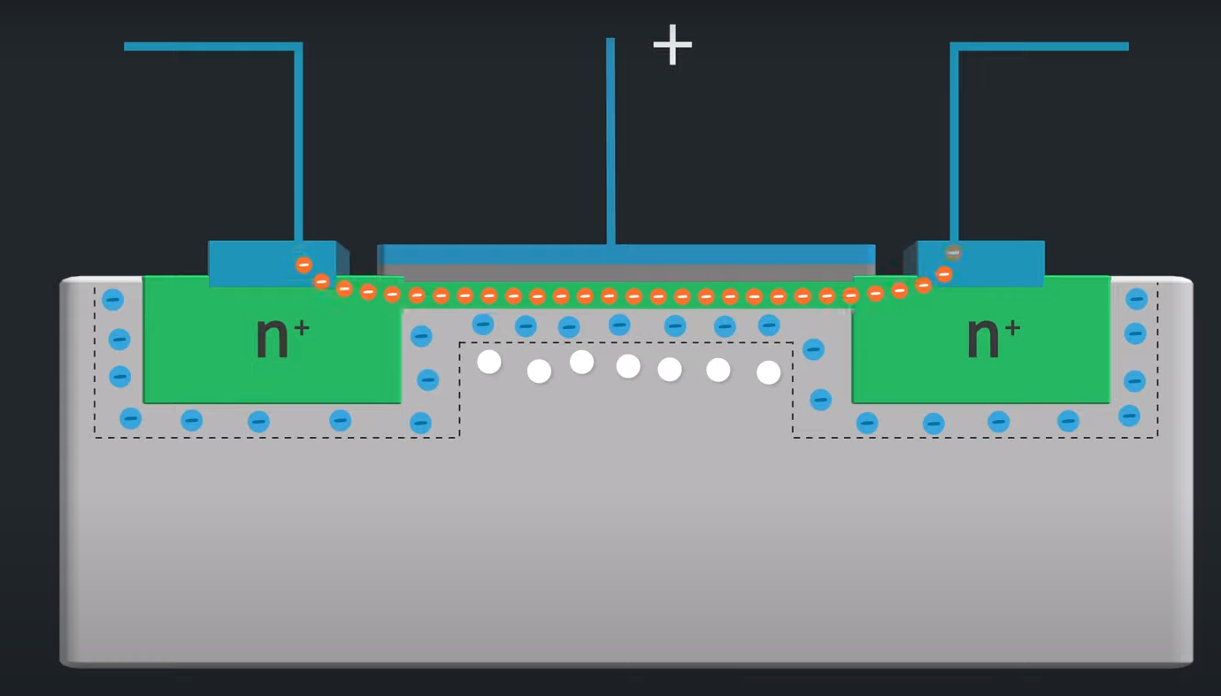 - “Enhanced type”: ==the “channel” (or “channel region”) forms when is great enough==, and allows the passage of current from source (S) to drain (D).