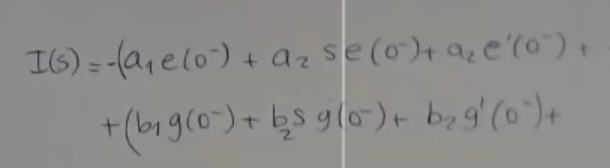 \begin{align}&E(s) \kern2px + \\ & a_1sE(s) - a_1e(0^-) \kern2px + \\ & a_2s^2E(s) - a_2se(0^-)- a_2e'(0^-) = \\ &b_0G(s) \kern2px + \\ &b_1sG(s) - b_1g(0^-)\end{align}