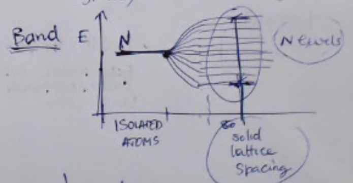 Here we can see a graphical representation, where we take individual particles and “group” them toghter in a unic solid, while we move them closer togheter we can see the energy levels forming.