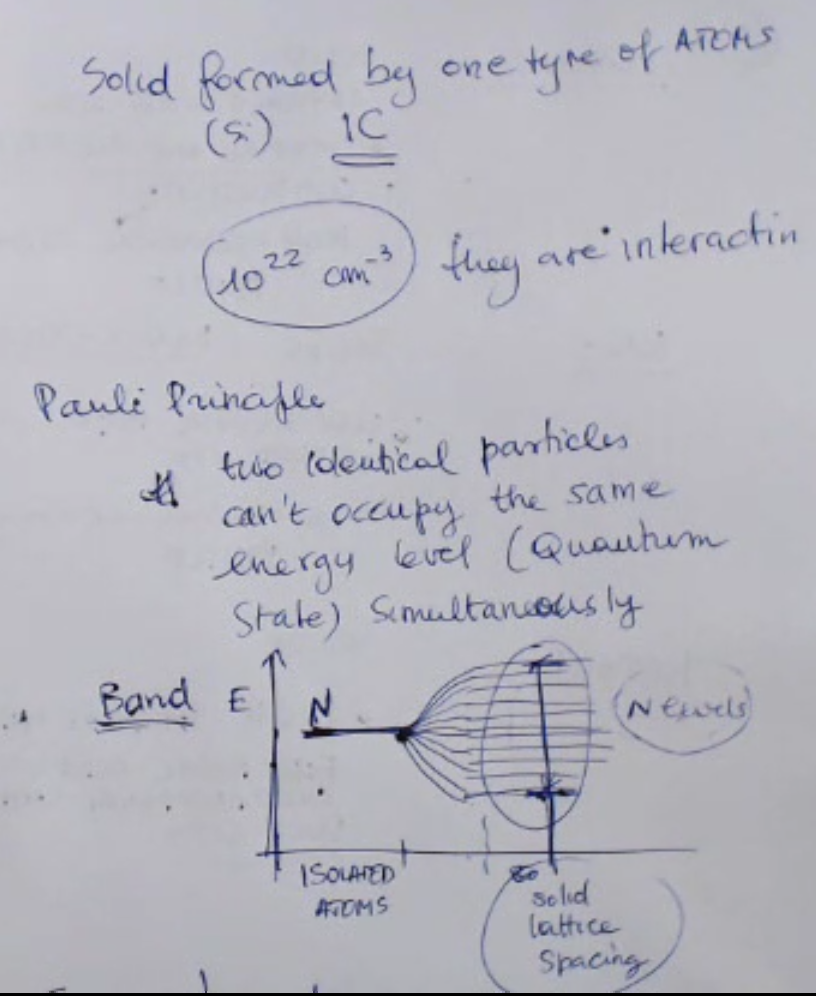 - If we form a solid, we put together and make a very large number of atoms interact with each other, the number of atoms which are bound together is so large that, due to the Pauli Principle, we will have so many different energy levels, (so due to the fact that they cannot be two identical levels in the same system), ==and these different energy levels are so close, dense and numerous that they can be considered as a continuum or a continuous interval of admitted levels, and these are called band==.