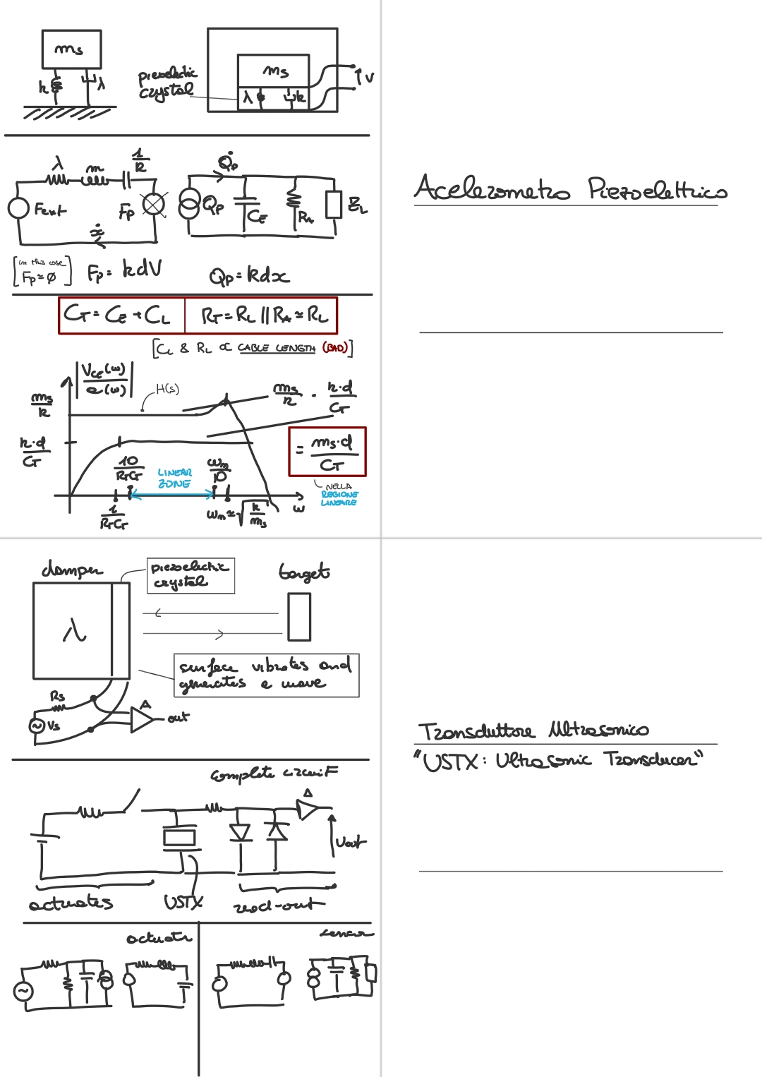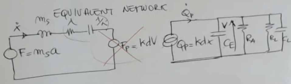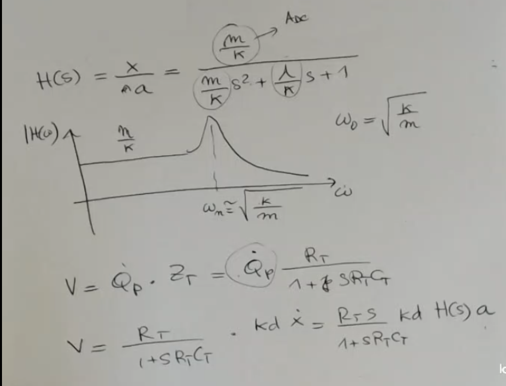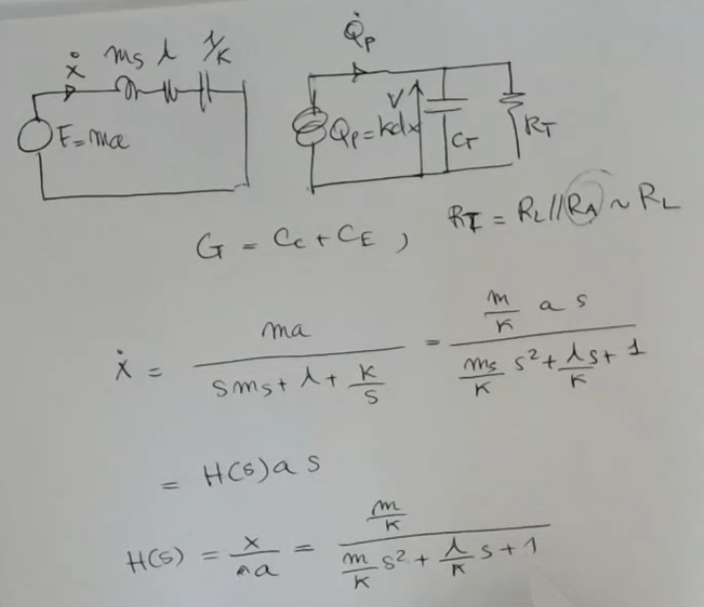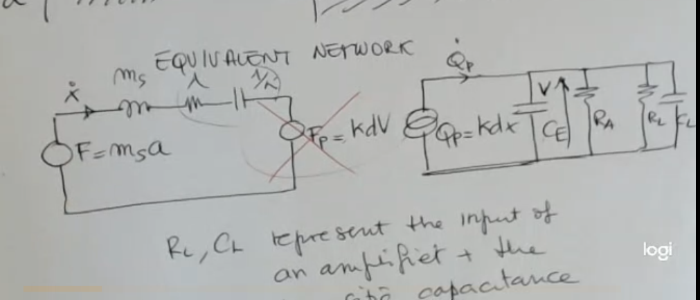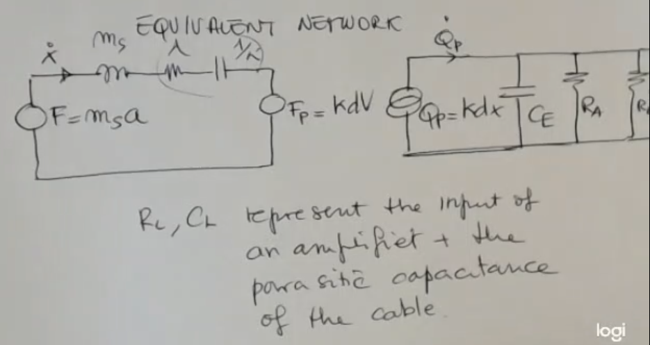 - For the electronic part instead is similar to what we have seen before, for piezoelectric sensor, but in this case we have also and , this represent the input of an amplifier (, really large) and the parasitic capacity of the cable (, really small).