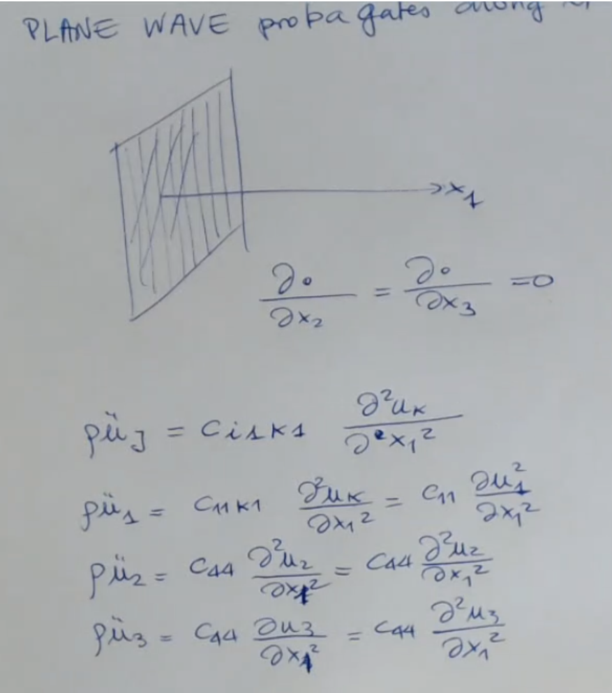 When we perform the derivative on and , both will result in a , so rememberIMPORTANTE :Using the wave equation:For a planar wave we find (specifically for isotropic materials, so that we can use the collapsed stifness tensor):IMPORTANTE Where: