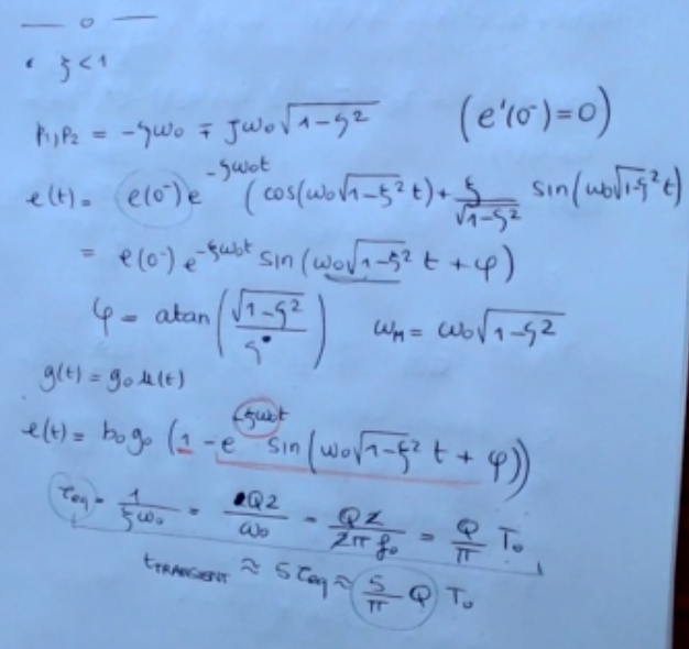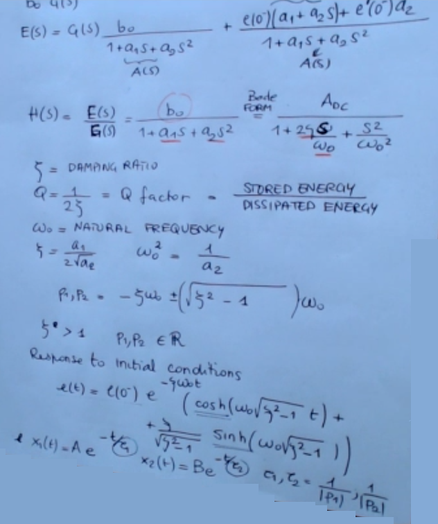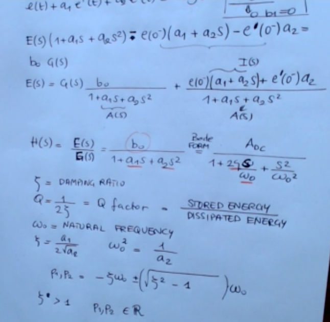 We have that is the damping ratio, ==an alternative way to express these behavior here is the factor which essentially describes the stored energy or power divided by the dissipated energy==. And then we have which is the natural frequency. Obviously we have that is: … Okay, the two poles , , are: …