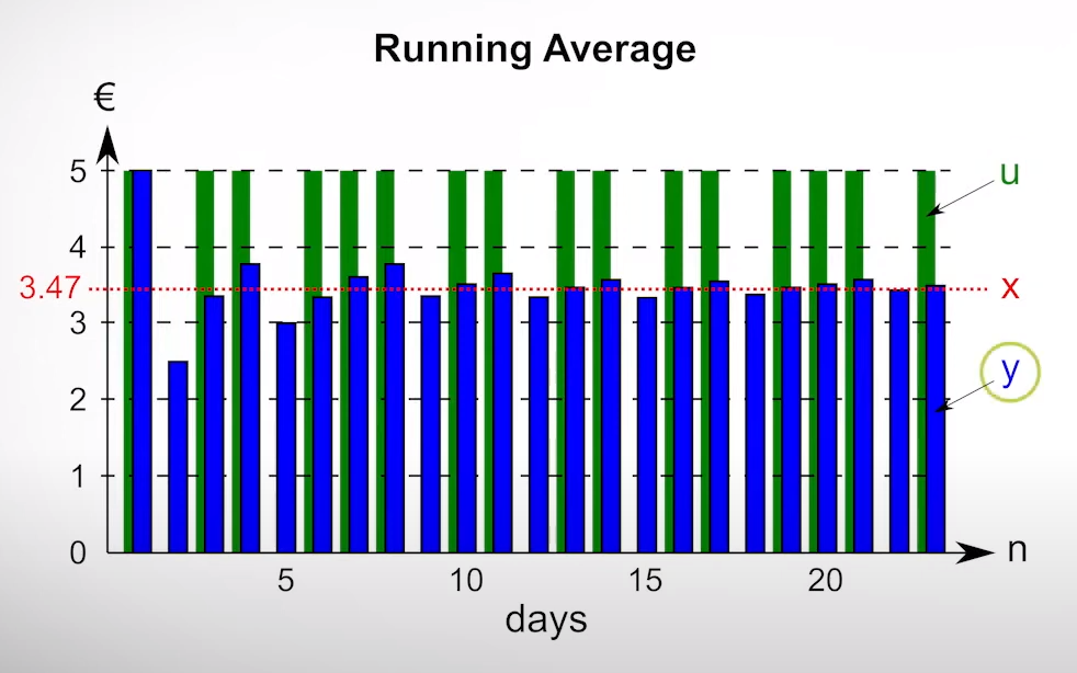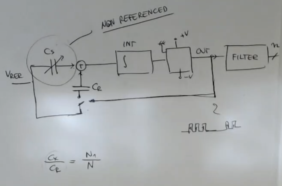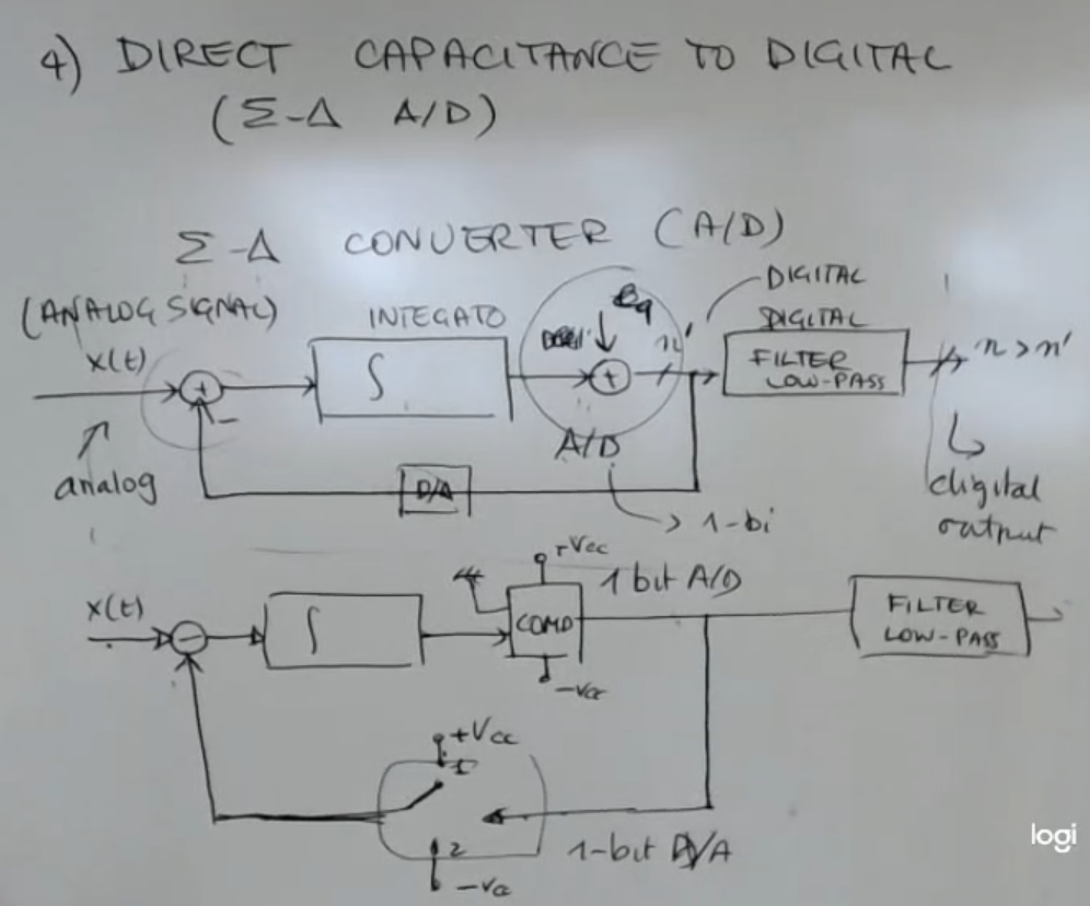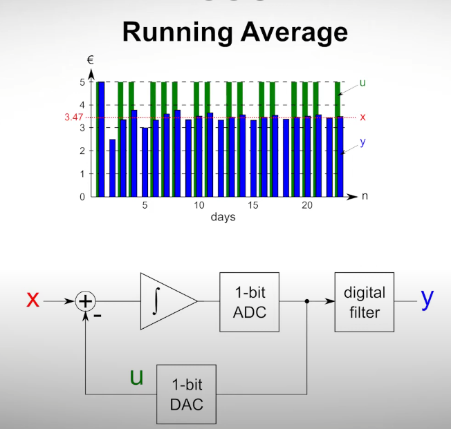 - Here, what happens is that the bit, A/D, at the end, outputs a , sequence whose average value: is actually the analog voltage input , so .