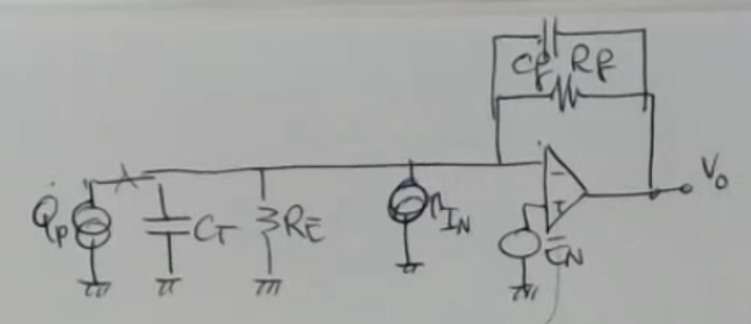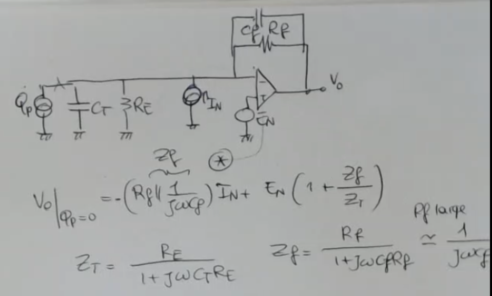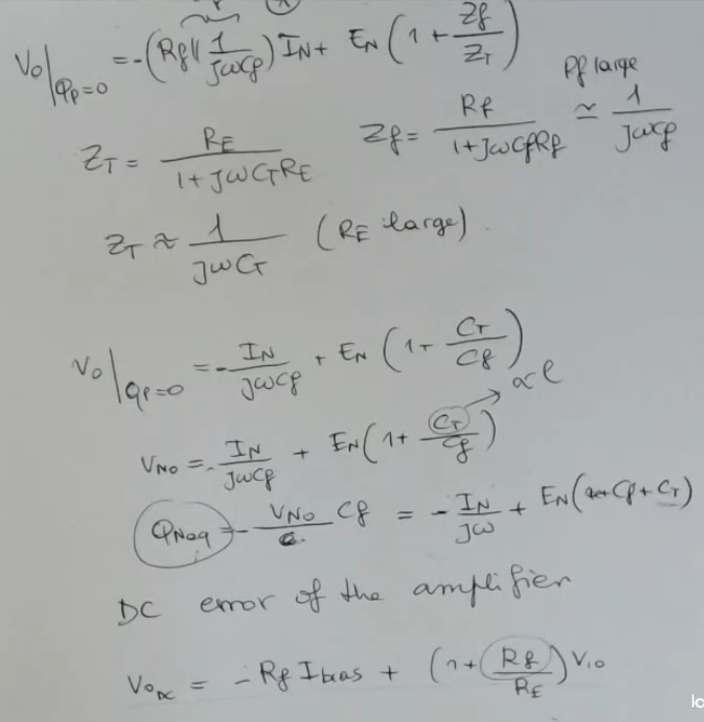 βWe can also find an equivalent noise by taking and multiplying it by , because this is, letβs say, the relationship between this charge and the output at the first approximationβ. - The formula is a bit of a mess, so here it is again: