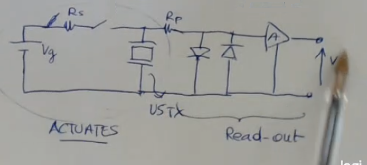- Note the switch after , when it is closed the sensor is used as an actuator, while when it is opened it is used as a sensor, and its output gets amplified by the amplifier.