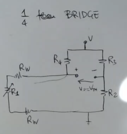 Letβs take into consideration a one-quarter resistive bridge, and add the wire resistance to the sensor, like so: